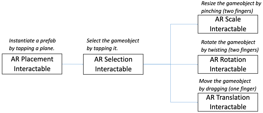 - Interactables: gameobjects that the user can interact with by tap, drag, press, etc.